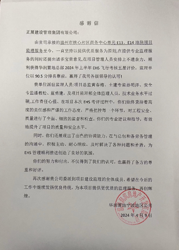 在4月3日,華潤置地總部 2024 年上半年 EHS 飛行該項目獲得考核五星評價,監(jiān)理單位取得 90.5 分的好成績。華潤置地寧波地區(qū)公司特向我公司發(fā)來感謝信。